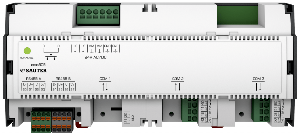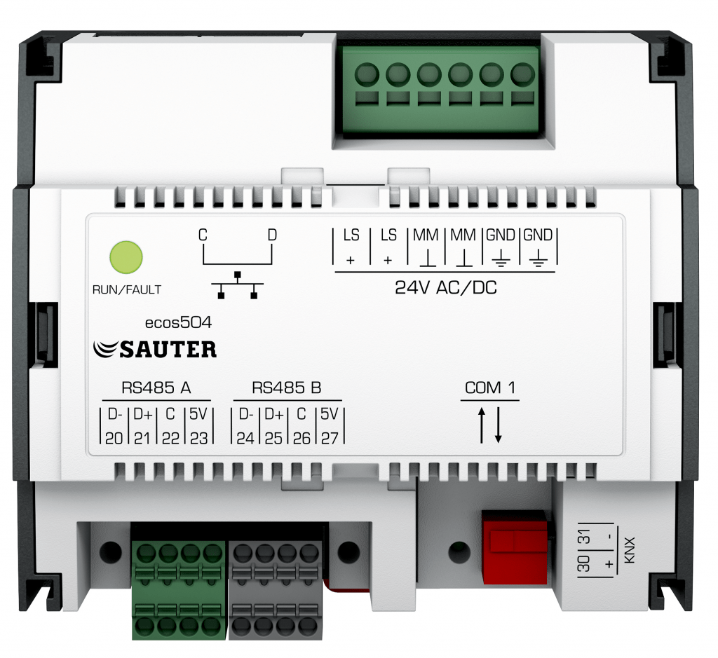 Les automates programmables ecos504/505 constituent le cœur des solutions intégrées d’automatisation de locaux proposées par SAUTER. Ils regroupent toutes les fonctions centrales dans un seul et même système : de la régulation de la température ambiante à la commande de l’éclairage, en passant par la gestion du système de protection solaire en fonction de la position du soleil. Tout cela étant contrôlé avec une grande précision de réglage. Les fonctions de détection de présence, de surveillance des contacts de fenêtre, de ventilation selon les besoins, de commande de l’éclairage et des stores ainsi que les consignes temporelles optimisent la consommation d’énergie.